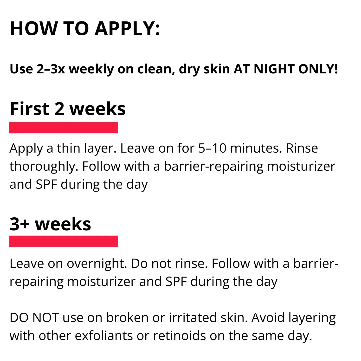 - Frequency: Use 1–2 times per week. Do not combine with other strong acids or retinoids in the same routine.